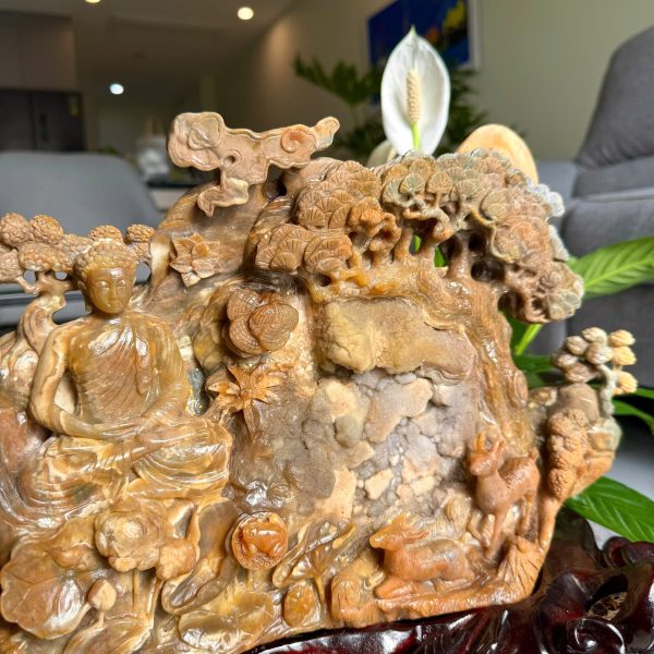 Một điểm đặc biệt hiếm thấy là ngay trên thân đá có thiết kế vị trí đặt trầm hương, được khoét khéo léo và an toàn. Khi đốt trầm, khói lan nhẹ quanh tượng tạo nên khung cảnh huyền ảo, giúp làm sạch không khí, xua tan phiền muộn và dẫn tâm quay về chánh niệm.