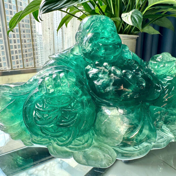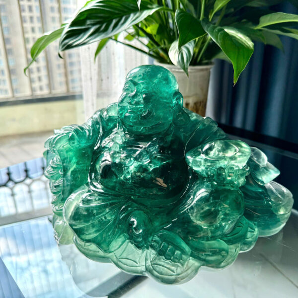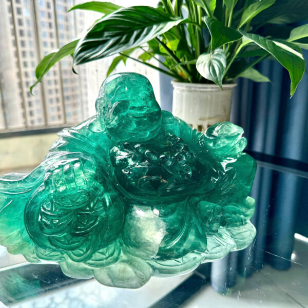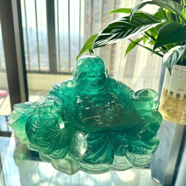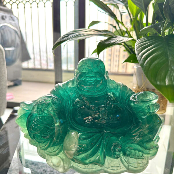 • Thu hút tài lộc – giải trừ phiền não: Hình tượng Phật Di Lặc từ xa xưa đã là biểu tượng của sự vui vẻ, sung túc và may mắn. Kết hợp với năng lượng thanh tẩy và ổn định cảm xúc của đá Fluorite, tượng giúp gia chủ xua tan ưu phiền, mời gọi tài lộc, tăng cường vận khí tốt.