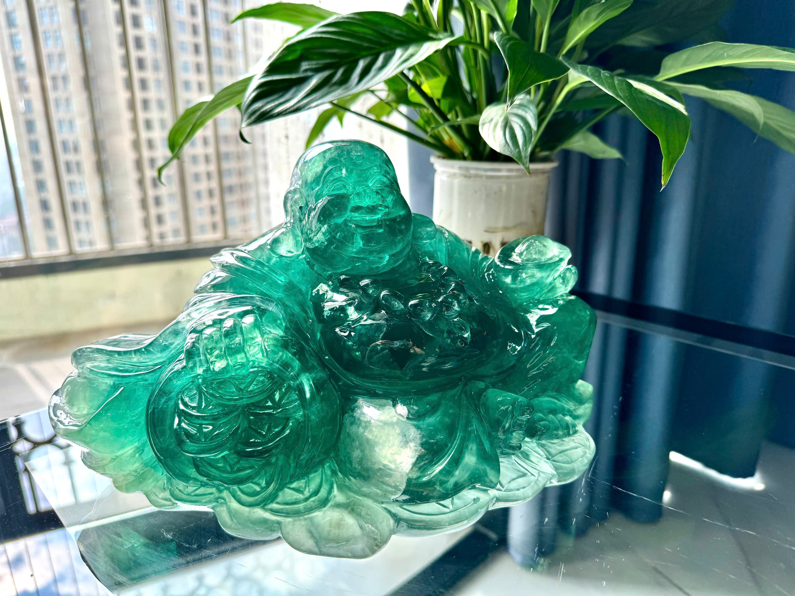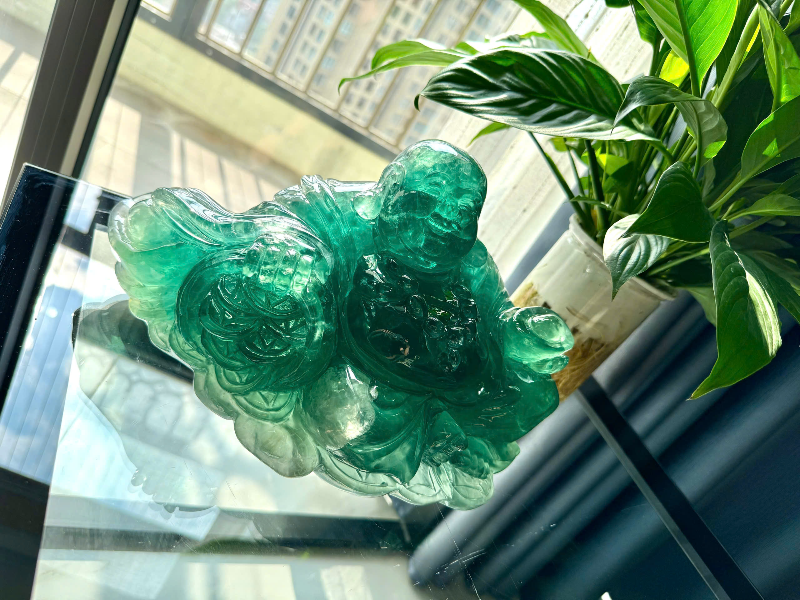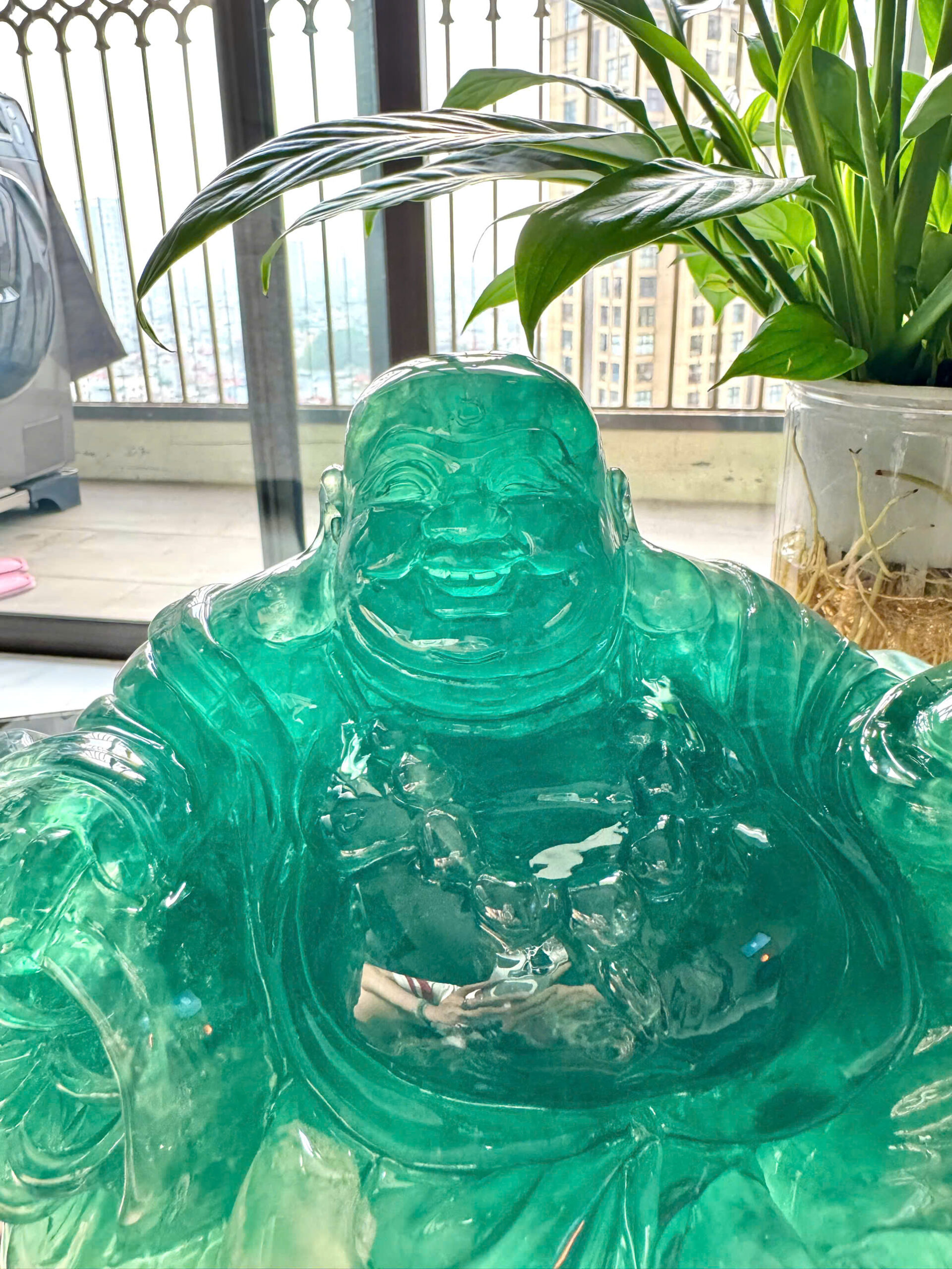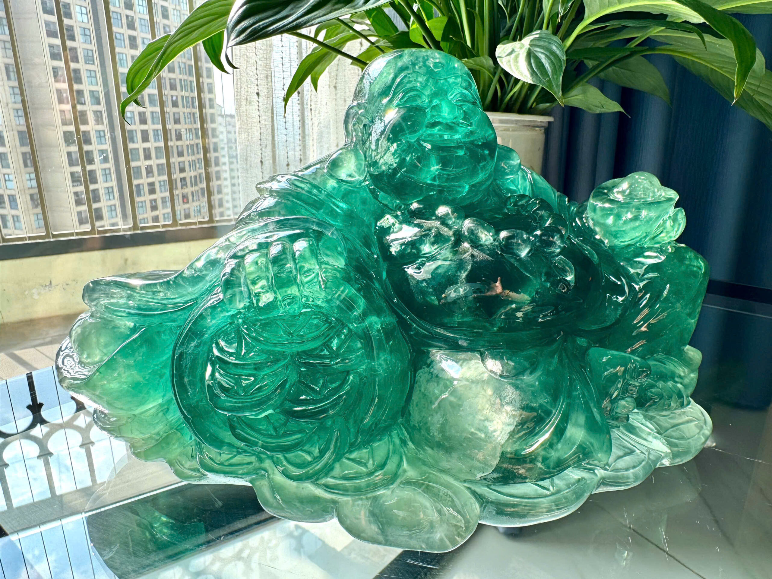 Tượng Phật Di Lặc này được tạc tay thủ công từ đá Fluorite tự nhiên nguyên khối – một trong những loại đá có khả năng thanh lọc năng lượng mạnh mẽ bậc nhất trong giới phong thuỷ.